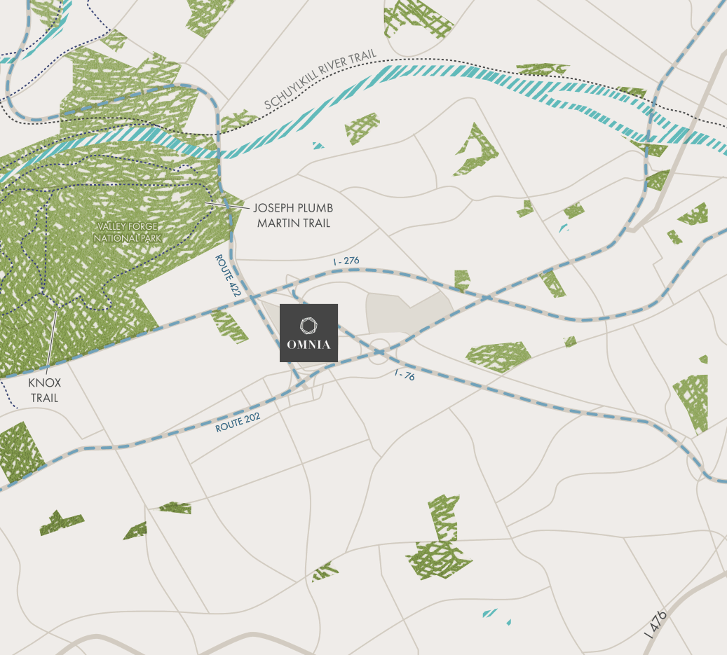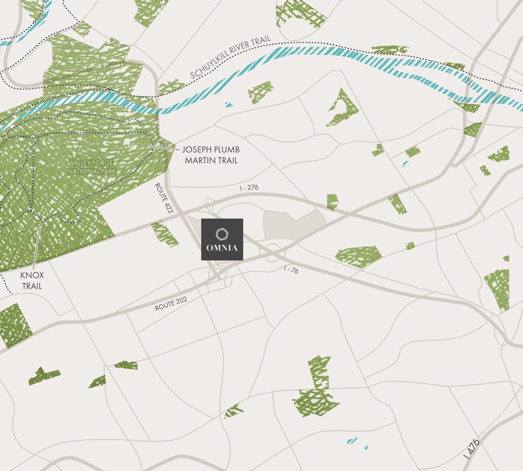 Ideally located in the center of Valley Forge, from here, take the train to Philly in 45 minutes, bike to the Valley Forge National Park in 12, or merge onto I-76 in under 5.